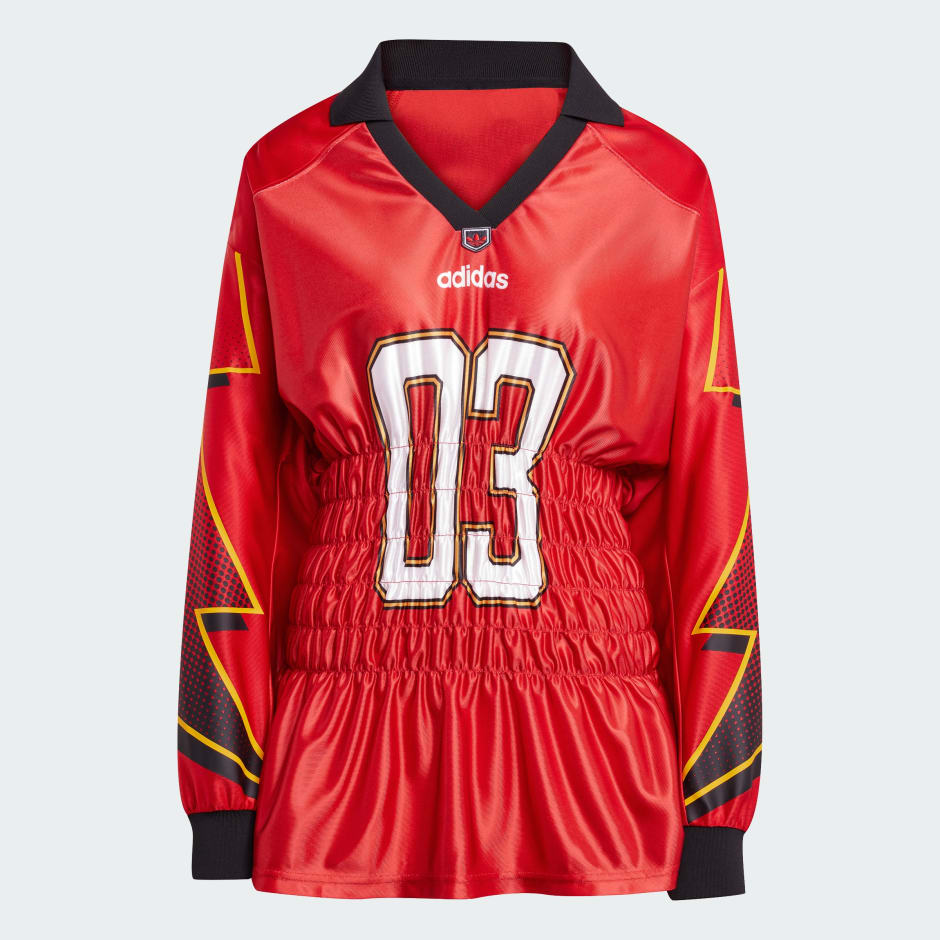 A flip of the script on what’s expected, this adidas jersey takes a familiar silhouette and injects it with some femme energy. The inspiration is American football â made clear from the premium graphic execution and collar. The waist gets cinched, though, with detailed ruching that brings in the shape and emphasises the voluminous sleeves. This product is made with 100% recycled materials. By reusing materials that have already been created, we help to reduce waste and our reliance on finite res