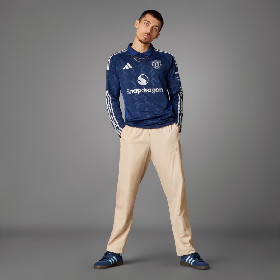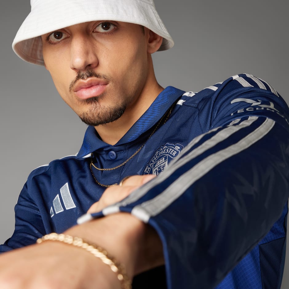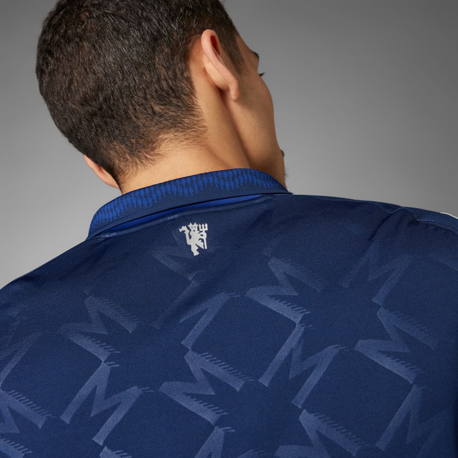 With a bold design that nods to football culture, this adidas Manchester United jersey looks equally at home on and off the pitch. Silver details pop against an indigo base that also includes a subtle, repeating “M” monogram. The light blue graphic on that stylish polo collar pays tribute to the river on which Old Trafford sits. Moisture-managing AEROREADY and long sleeves keep fans comfortable on away days.This product is made with 100% recycled materials. By reusing materials that have already been created, we help to reduce waste and our reliance on finite resources and reduce the footprint of the products we make.